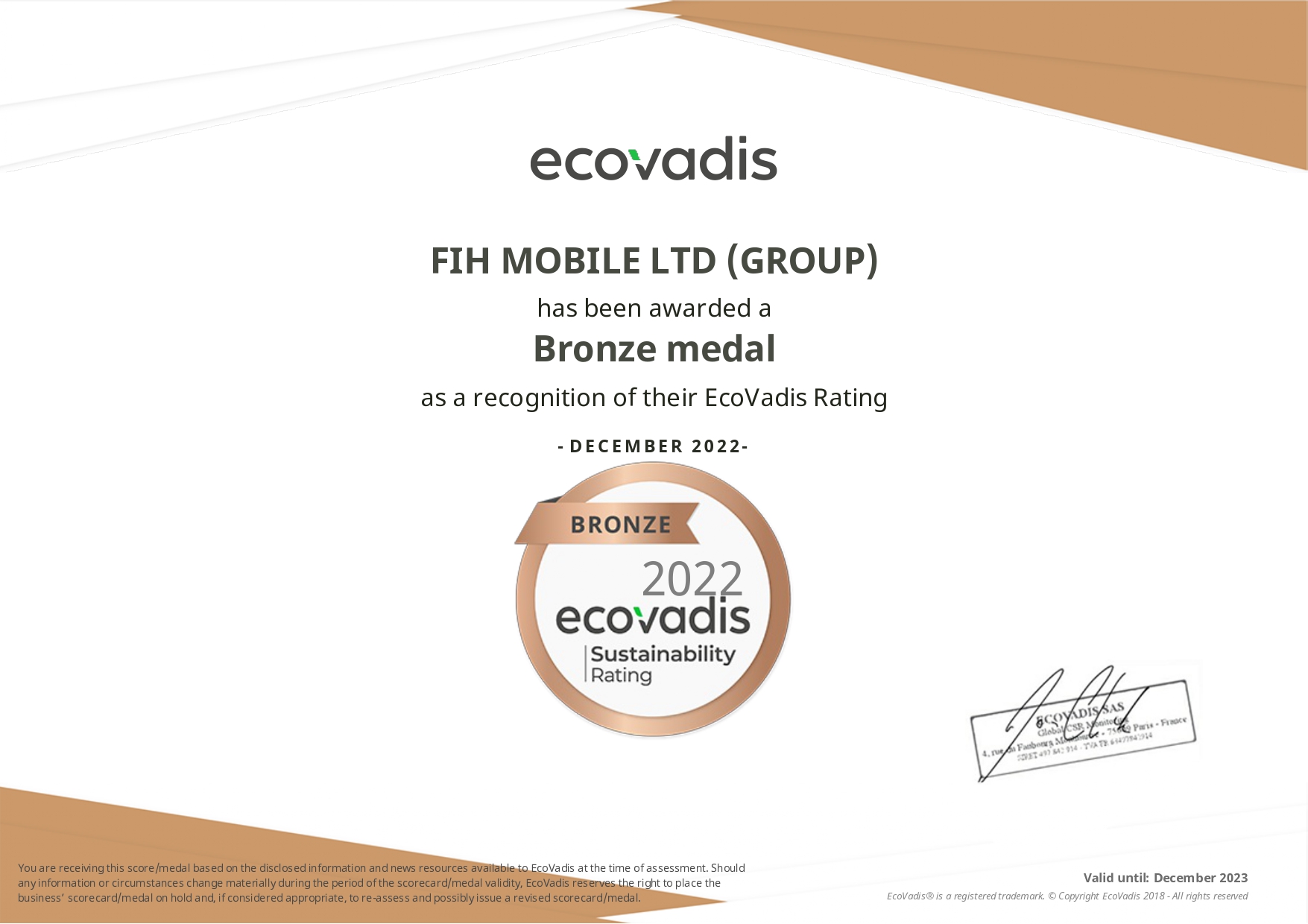 富智康荣获2022年EcoVadis永续评鉴平台(Supplier Sustainability rating)铜级认证。